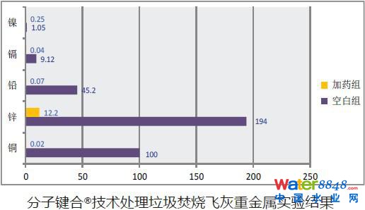 可利用分子鍵合技術(shù)將焚燒后的飛灰進(jìn)行單獨(dú)收集,通過添加分子鍵合穩(wěn)定劑,對(duì)飛灰中的重金屬進(jìn)行固化穩(wěn)定化處理,使飛灰中的重金屬浸出濃度明顯降低,遠(yuǎn)遠(yuǎn)低于《生活垃圾填埋場(chǎng)污染控制標(biāo)準(zhǔn) GB 16889-2008》中所規(guī)定的標(biāo)準(zhǔn)限值,經(jīng)穩(wěn)定無害化后的飛灰可進(jìn)行填埋。該技術(shù)有效降低了飛灰的處置費(fèi)用和難度。