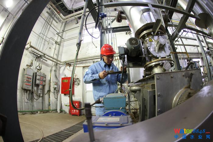 圖為2月2日水務(wù)部一線職工正在查看污泥干化機動轉(zhuǎn)情況