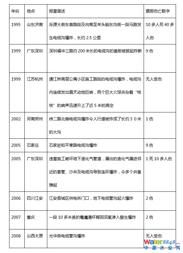 雖然近年香港發(fā)生的沙井爆炸事故并未有帶來重大的傷亡,這些事故卻為我們敲響了警號,意識到地下密閉空間的危機。地底除了沙井的密閉空間外,電纜溝也存有類似條件的環(huán)境。尤幸香港所有的地底電纜,如大部分歐美國家一樣,都是直埋式,沒有采用電纜溝的形式。直埋式設(shè)計除了減少密閉空間的情況,亦有幫助電纜的散熱功能。相反,在國內(nèi),由于經(jīng)營電訊網(wǎng)絡(luò)的公用事業(yè)單位少,電訊沙井的密度較低,所以發(fā)生電訊沙井連環(huán)爆炸的風(fēng)險較低。但是,在國內(nèi),采用電纜溝來敷設(shè)地下公用設(shè)施卻是一個非常普遍的手段。雖然電纜溝能為規(guī)劃、施工及日后設(shè)施的維護保養(yǎng)帶來很大的便利,可是電纜溝是一個延綿不斷的巨大密閉空間,其空間的容積一般比沙井大數(shù)倍到數(shù)十倍。同時,在電纜溝內(nèi)產(chǎn)生火花的機會也較其它公用設(shè)施為大。如果電纜溝沒有氣密性的設(shè)計考慮,地下可燃性氣體便有機會滲漏進電纜溝內(nèi),并加以積聚。積聚在電纜溝內(nèi)的可燃性氣體一旦被燃點而發(fā)生爆炸,爆炸的威力足以延綿數(shù)公里,后果之嚴重性是不堪設(shè)想的!在1995年,山東濟南市便發(fā)生了一宗中壓鑄鐵煤氣管被壓斷破裂,導(dǎo)致煤氣經(jīng)土壤流竄入電纜溝。最終導(dǎo)致長約2.5公里的電纜溝爆炸,造成10多人死亡40多人受傷。在2005年,廣東省深圳市福田區(qū)有地下液化氣管道因遭違章施工而受到破壞,令泄漏的液化氣流竄入鄰近的套管、沙井及電纜溝導(dǎo)致連環(huán)爆炸。爆炸還掀起了道路沿線約200米長電纜溝的蓋板等物件,釀成110多人傷。根據(jù)報章報導(dǎo),包括以上兩宗電纜溝意外事故,在過往多年共有多宗導(dǎo)致傷亡的電纜溝爆炸事故,列舉如下: