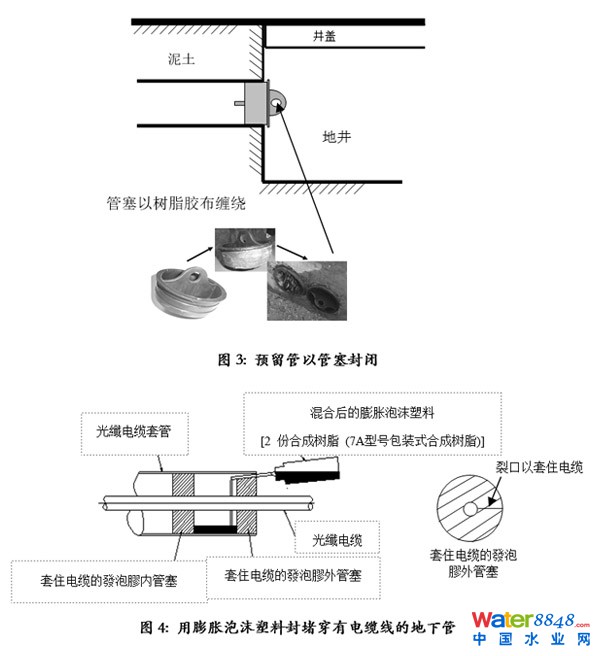 進入沙井及電纜溝的連接管道,分為預(yù)留管及已放置電纜的管道。封閉預(yù)留管,只要用一個價值港幣數(shù)元的簡單管塞(3) 便可;已放置電纜的管道,則可用膨脹泡沫塑料封閉(4)。這些封填物在有需要時皆可輕易移走,并不影響日后的維修工作,但卻可大大減低燃氣進入沙井的機會及爆炸的風(fēng)險。