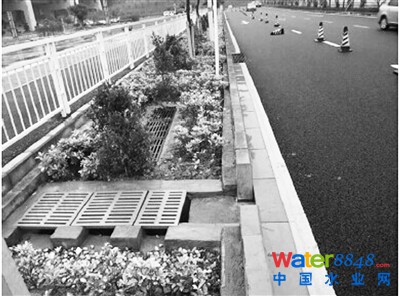 海綿城市要吸納點(diǎn)點(diǎn)滴滴 圖為海綿城市街邊植草溝。雨水通過(guò)護(hù)路磚的豁口流入植草溝下滲。溢流時(shí)可通過(guò)雨水收集口進(jìn)行收集
