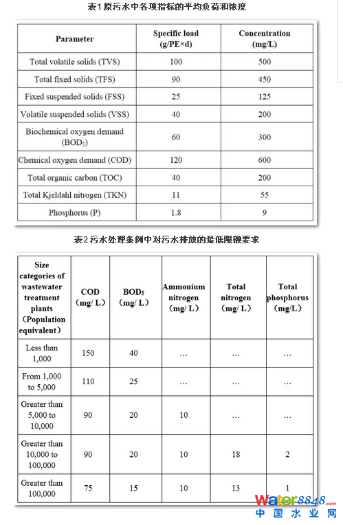 如之前所述,20世紀(jì)末期,生物處理工藝在各個污水處理廠得以廣泛應(yīng)用,甚至包括小型污水處理廠以及分散型污水處理廠。對人口當(dāng)量小于5000的小型污水處理廠而言,BOD5和COD是唯一的去除對象;對于人口當(dāng)量為5000~10000的污水處理廠而言,除了BOD5、COD以外,氨氮也是需要去除的對象;對于人口當(dāng)量大于10000的大型污水處理廠而言,除上述去除對象外,還需要去除氮、磷等營養(yǎng)物。表1展示了原污水中的各項指標(biāo)平均負(fù)荷和濃度;表2展示了污水處理后的最低排放要求。