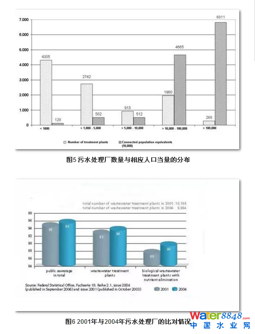 為了滿足以上排放標(biāo)準(zhǔn),德國目前大約有10000座污水處理廠在運行當(dāng)中。這些污水廠大約需要處理8千萬人口當(dāng)量的生活污水以及5千萬人口當(dāng)量的工商業(yè)污水,這些工商業(yè)污水也會排入當(dāng)?shù)毓才潘到y(tǒng)。具體情況見圖5和圖6。