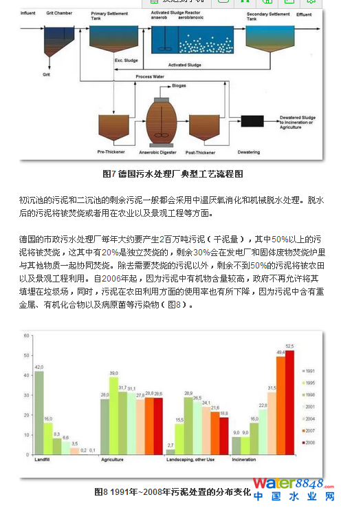 德國的市政污水處理廠每年大約要產(chǎn)生2百萬噸污泥(干泥量),其中50%以上的污泥將被焚燒,這其中有20%是獨立焚燒的,剩余30%會在發(fā)電廠和固體廢物焚燒爐里與其他物質(zhì)一起協(xié)同焚燒。除去需要焚燒的污泥以外,剩余不到50%的污泥將被農(nóng)田以及景觀工程利用。自2006年起,因為污泥中有機物含量較高,政府不再允許將其填埋在垃圾場,同時,污泥在農(nóng)田利用方面的使用率也有所下降,因為污泥中含有重金屬、有機化合物以及病原菌等污染物(圖8)。
