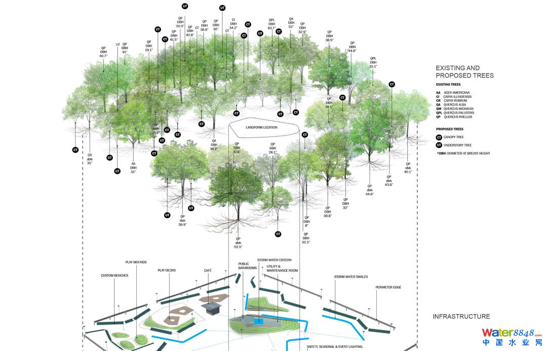 突起的地形起到地面公共設(shè)施核心的作用,可以把對(duì)根部系統(tǒng)的破壞降到最低,同時(shí)設(shè)有雨水蓄水池、盥洗室和雜