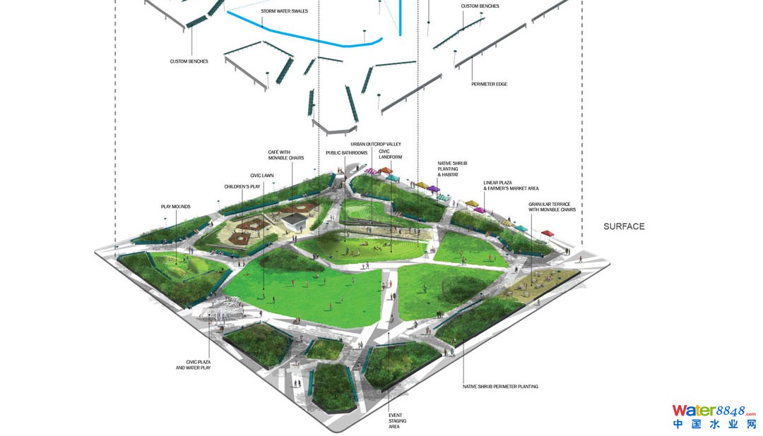 成了天然的露天競(jìng)技場(chǎng),人們還可以在那里沐浴日光,欣賞美景。規(guī)劃還設(shè)計(jì)了一系列可持續(xù)項(xiàng)目,比如:將雨水