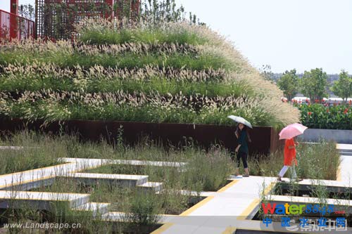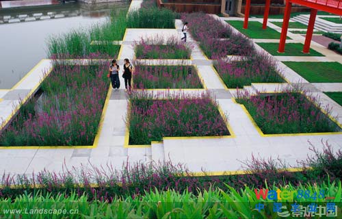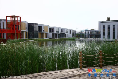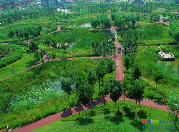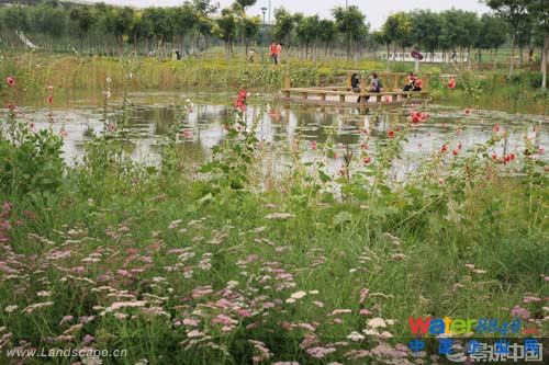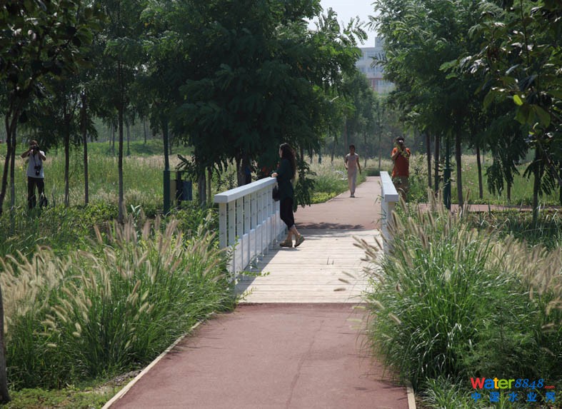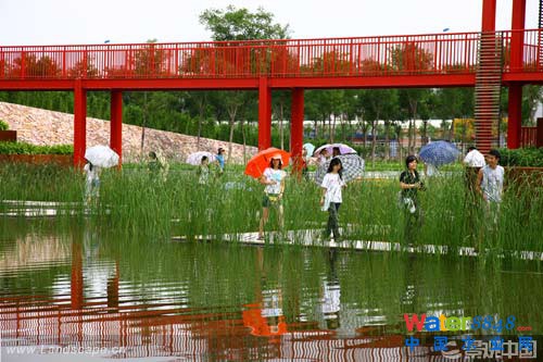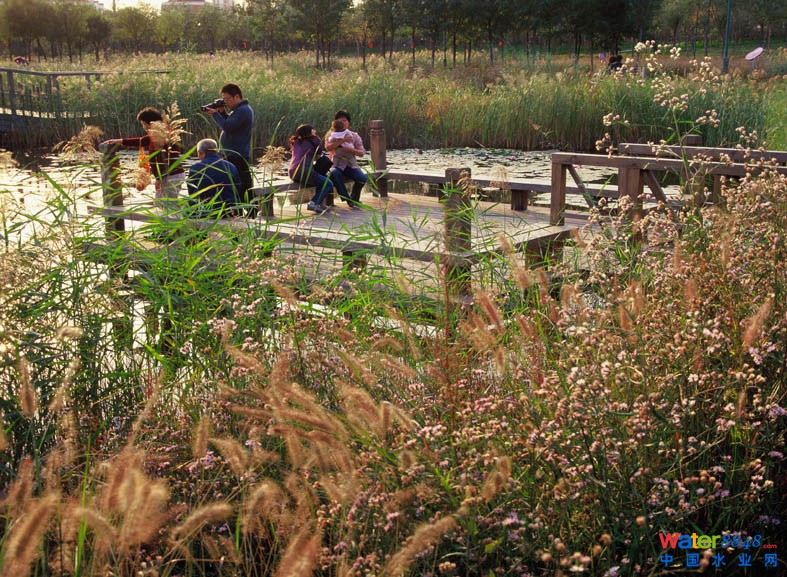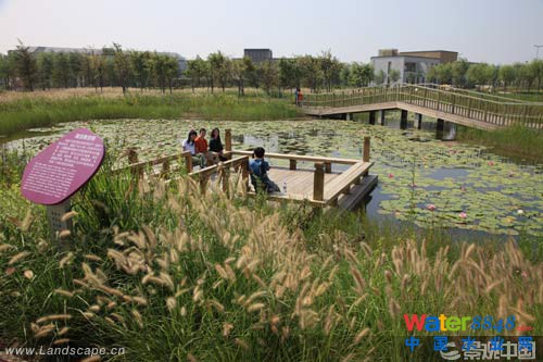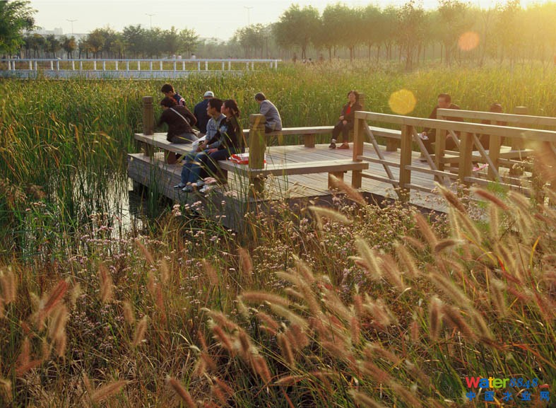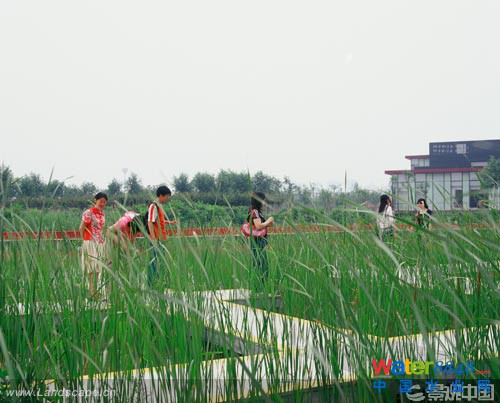 (3)濕地-湖泊帶:包括帶狀湖泊和兩側(cè)的濕地。外圍為臨湖親水帶,由順地勢(shì)跌落的棧橋構(gòu)成,豐富的水際植物掩映著穿越其中的棧橋,使人與水和生物近距離接觸;在內(nèi)側(cè)(湖的西、北側(cè))為大片的濕地,恢復(fù)和再現(xiàn)天津地域性景觀(guān),由蘆葦和其他濕地植物構(gòu)成。一條蜿蜒的步道棧橋穿越其中,并穿連多個(gè)木平臺(tái)和蔭棚。兩個(gè)濱水濕地都是濕地植物的科普走廊,也即取樣天津濕地植物。