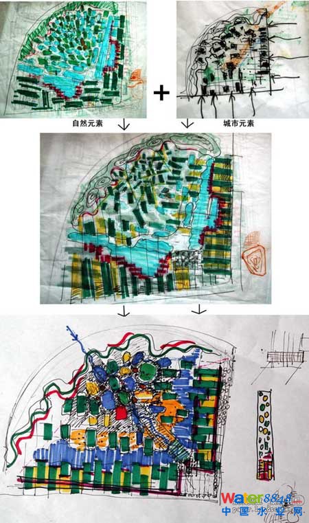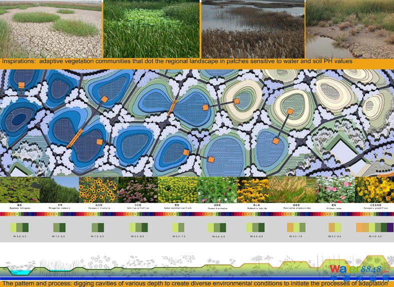 3 設(shè)計(jì)理念:讓自然工作。在不同的補(bǔ)丁有不同的水和土壤PH值,引發(fā)各自的生境適應(yīng)過(guò)程。靈感來(lái)自于場(chǎng)地中棲息地斑塊的PH值對(duì)水的敏感性。