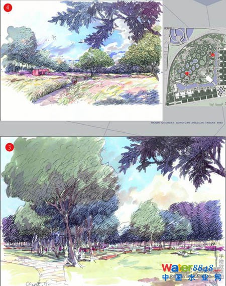 (2)高臺(tái)-沉床園帶:城市林帶之內(nèi)有規(guī)律地交錯(cuò)分布著高臺(tái)和下沉庭院。臺(tái)地高達(dá)五米,其上為一條橫跨廊道相串聯(lián);臺(tái)地給平原上的城市和綠地一種新的體驗(yàn),每個(gè)臺(tái)地上都密植一種鄉(xiāng)土樹(shù)種的有幼苗,形成濃密的綠塊,也即取樣天津鄉(xiāng)土樹(shù)種,同時(shí)表明對(duì)社會(huì)上盛行的大樹(shù)移植之風(fēng)的反對(duì)立場(chǎng),告訴人們幼苗也是很美的;每一幼苗綠塊之中為一宜人尺度的小廣場(chǎng)和蔭棚,各具特色;臺(tái)地的邊坡由金礦、鐵礦、銅礦等各種礦石鋪成,是對(duì)天津作為工業(yè)和港口城市的反應(yīng),也即取樣天津工業(yè)材料。在每?jī)蓚(gè)臺(tái)地之間是一個(gè)20X10米見(jiàn)方的下沉式小花園,依地勢(shì)布置臺(tái)階可以席坐,是大尺度的環(huán)境中的一個(gè)個(gè)親人空間。沉床園設(shè)計(jì)精細(xì),以鄉(xiāng)土禾草植物為主,也即取樣天津鄉(xiāng)土野草。除高臺(tái)和下沉庭院以外,是樹(shù)蔭下的城市廣場(chǎng)區(qū)域,以硬質(zhì)地面為主。高臺(tái)和連廊構(gòu)成了一個(gè)個(gè)窗景,讓公園的綠色流露到城市,也給造訪(fǎng)者營(yíng)造了一個(gè)個(gè)誘人的豁口。