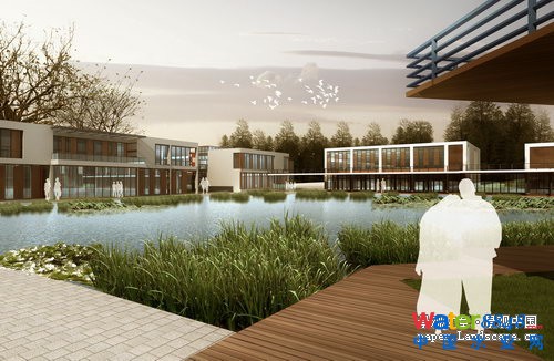 (8)一組服務(wù)設(shè)施:在公園的西南角,是一組服務(wù)性建筑,它們以水為明堂,半圍合布局,互相之間以廊道、棧橋相聯(lián)系。建筑兩層為主,輕盈而親切,飄浮于水面和濕地之上,主要提供餐飲、茶吧、酒吧、書(shū)吧等服務(wù)。