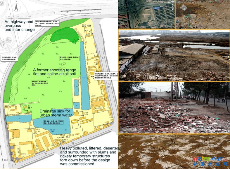 這是一個(gè)在天津的公園,場(chǎng)地被城市快速路包圍,是一塊垃圾遍布,收到污染,被人遺忘的區(qū)域,并且有相當(dāng)嚴(yán)重的鹽堿地問(wèn)題。2003年,天津市政府打算改造這里,并將這個(gè)艱巨的任務(wù)交到了景觀(guān)設(shè)計(jì)師手中。