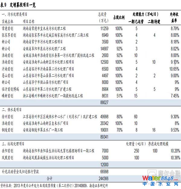 2013年8月發(fā)布非公開(kāi)發(fā)行預(yù)案,14年末已核準(zhǔn),以15個(gè)市政項(xiàng)目與補(bǔ)充流動(dòng)性資金為募投方向,募集資金20.54億元。預(yù)案中涉及10個(gè)污水處理項(xiàng)目,處理能力合計(jì)59萬(wàn)噸/日、3個(gè)供水項(xiàng)目,處理能力合計(jì)79萬(wàn)噸/日和2個(gè)生活垃圾處理項(xiàng)目,處理能力合計(jì)350噸/日。(Ps下圖有錯(cuò),淮南首創(chuàng)1.25億的項(xiàng)目在第二次修訂中取消了,補(bǔ)充流動(dòng)資金改成6.1億)