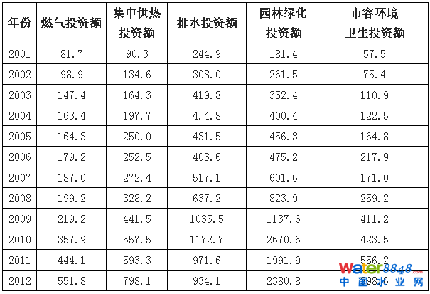 城市環(huán)境基礎(chǔ)設(shè)施建設(shè)投資是環(huán)保投資的重要組成部分,但是目前我國(guó)的環(huán)保設(shè)施運(yùn)行效率不容樂(lè)觀。我國(guó)的城市環(huán)境基礎(chǔ)設(shè)施建設(shè)投資在供熱、排水、園林綠化方面相對(duì)較多,在燃?xì)、供熱、排水、園林綠化和市容環(huán)境衛(wèi)生五個(gè)方面都呈逐年上升態(tài)勢(shì),尤其是園林綠化方面,投資額由2001年的181.4億元增長(zhǎng)到2012年的2380.8億元,增長(zhǎng)了13倍,燃?xì)馔顿Y額增長(zhǎng)了7倍,供熱方面增長(zhǎng)了近9倍,排水投資額增長(zhǎng)了近4倍,市容環(huán)境衛(wèi)生投資方面增長(zhǎng)了7倍。