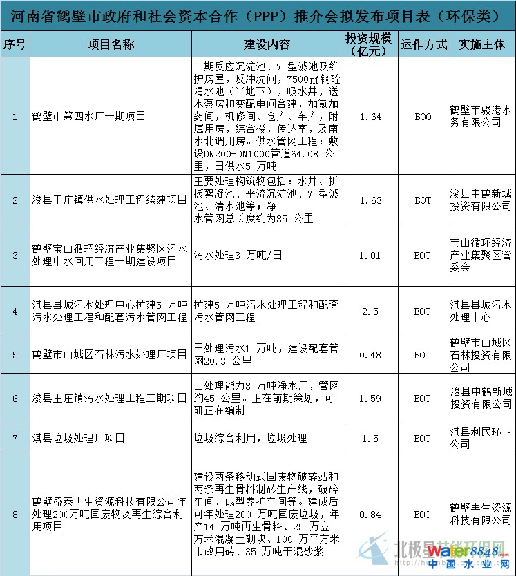 河南省鶴壁市發(fā)布首批42個(gè)PPP項(xiàng)目 共含8個(gè)環(huán)保項(xiàng)目 總投資額293.9億元