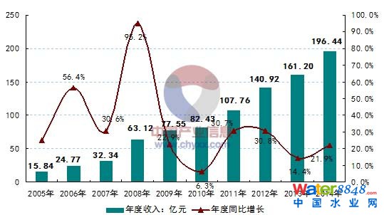 中國產(chǎn)業(yè)信息網(wǎng)發(fā)布的《2015-2020年中國環(huán)境監(jiān)測(cè)市場(chǎng)供需預(yù)測(cè)及市場(chǎng)專項(xiàng)調(diào)研報(bào)告》指出:中國環(huán)境監(jiān)測(cè)儀器行業(yè)的銷售收入逐年增加,由2005年的15.84億元上升為2014年的196.44億元。近幾年我國環(huán)境監(jiān)測(cè)儀器行業(yè)的銷售收入情況如下圖所示: