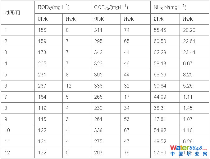 2012年該廠處理廢水1 000多萬t,年運(yùn)行320 d,電耗約0.299 kW˙h/m3.2012年污水處理廠的運(yùn)行情況如表 2所示。