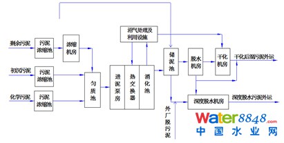 上海天山污水處理廠污泥深度脫水工程設(shè)計(jì)規(guī)模為干污泥量13tDS/d,總投資約為2600萬元。主要流程為離心濃縮+藥劑調(diào)理+隔膜壓濾機(jī)脫水,它將污 泥含水率降至60%以下,滿足運(yùn)送至填埋場處置的要求。該工程的建設(shè)是為了保障近期上海市中心城區(qū)污水處理廠污泥的出路,并通過建設(shè)高標(biāo)準(zhǔn)除臭工程改善周邊大氣環(huán)境質(zhì)量。