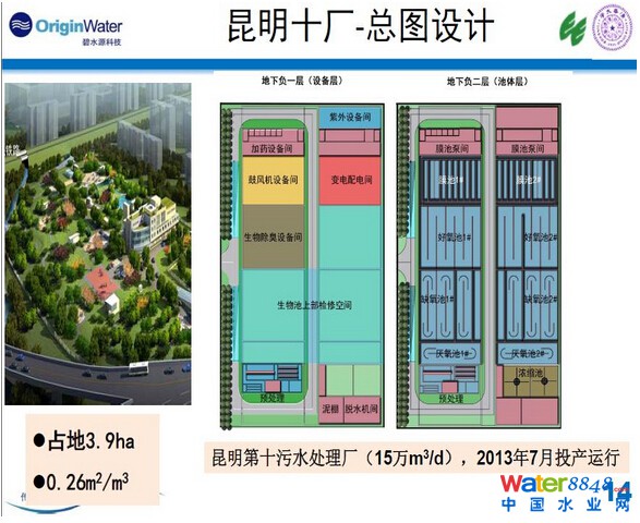 改造后污水處理主體工藝采用“A2O-節(jié)能MBR”工藝,比傳統(tǒng)MBR工藝節(jié)省膜曝氣能耗1/3以上,出水采用臭氧紫外聯(lián)合氧化消毒方式,并設(shè)有臭氣收集與生物除臭裝置。所有構(gòu)筑物均建于地下,生產(chǎn)性建筑物及辦公、生活區(qū)統(tǒng)一建于地上。