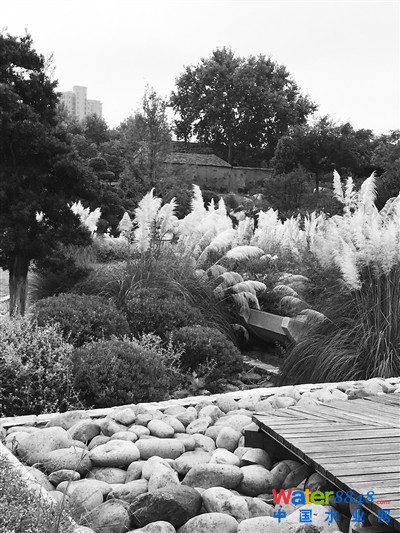 在江蘇省鎮(zhèn)江市西津渡街旁,兩名工人正在對(duì)玉山公園內(nèi)的植物進(jìn)行養(yǎng)護(hù);乩葪蛑苓叿N植了芒草等耐旱耐澇的植物,河溝里用大顆的鵝卵石進(jìn)行鋪設(shè)。如果不是鎮(zhèn)江市給排水管理處的工作人員孟憲威告訴記者,這是海綿城市的組成部分——“海綿體”,記者對(duì)玉山公園的印象還是僅停留在“公園”兩個(gè)字上而已。