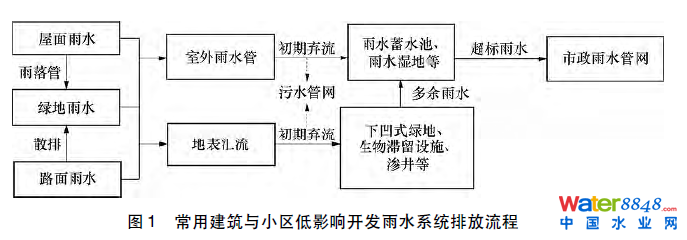 常用建筑與小區(qū)低影響開發(fā)雨水系統(tǒng)排放流程如圖 1 所示。