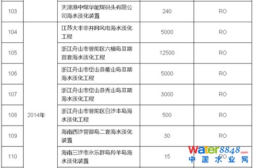 截止2014年底,全國(guó)已建成萬(wàn)噸級(jí)以上海水淡化工程27個(gè),產(chǎn)水規(guī)模812800噸/日;千噸級(jí)以上、萬(wàn)噸級(jí)以下海水淡化工程34個(gè),產(chǎn)水規(guī)模104500噸/日;千噸級(jí)以下海水淡化工程51個(gè),產(chǎn)水規(guī)模9605噸/日。最大海水淡化工程規(guī)模為20萬(wàn)噸/日。下表為全國(guó)沿海已建成的海水淡化工程統(tǒng)計(jì)。