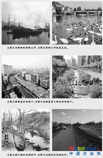 21世紀(jì)初,韓國政府下決心對其開展綜合整治和水質(zhì)恢復(fù),主要采取了3方面措施:一是疏浚清淤。2005年,總投資3900億韓元(約3.6億美元)的“清溪川復(fù)原工程”竣工,拆除了河道上的高架橋,清除了水泥封蓋,清理了河床淤泥,還原了自然面貌。二是全面截污。兩岸鋪設(shè)截污管道,將污水送入處理廠統(tǒng)一處理,并截流初期雨水。三是保持水量。從漢江日均取水9.8萬噸,通過泵站注入河道,加上凈化處理的2.2萬噸城市地下水,總注水量達(dá)12萬噸,讓河流保持40厘米水深。