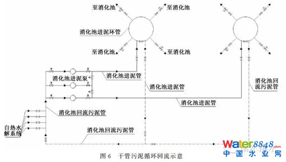 (2)關(guān)于熱水解污泥性質(zhì):在熱水解污泥進入消化池前需稀釋和冷卻。稀釋的目地在于:降低污泥溫度以保護消化池進泥泵運行;降低污泥粘度;避免氨濃度過高對厭氧消化產(chǎn)生抑制;將污泥調(diào)整至適宜的含固率。熱水解后污泥呈酸性,在沒有與消化池混合液進行混合前,會因溫度過低出現(xiàn)油脂凝固即所謂“蠟化”現(xiàn)象,進而堵塞換熱器和管道等。為解決這一問題,工程設(shè)計中需將換熱器冷端污泥溫度控制在70°C以上,當不能保證時,還可提高進入換熱器的冷卻水冷端溫度。此外,當熱水解啟動初期,由于污泥量少,為避免長距離輸送的管道阻塞,需保證污泥在管道中的流速(最小流速0.3 m/s,最小管徑DN100),例如在干管上進行污泥循環(huán)回流(見下圖)。熱水解污泥直接進入消化池會破壞消化環(huán)境,為使熱水解污泥進入消化池前從酸性向堿性轉(zhuǎn)化,一般需采用循環(huán)消化池污泥的方法,將熱水解出泥和消化池循環(huán)污泥進行混合,這樣有利于對熱水解污泥起到均質(zhì)均溫、調(diào)整pH的作用。