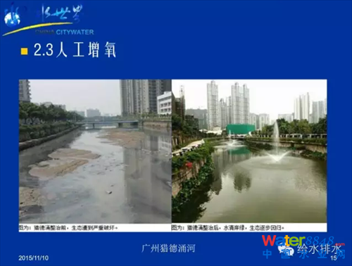 圖2是廣州的獵德涌河,在治理之前臭不可聞,污染非常嚴(yán)重,經(jīng)過(guò)人工增氧的方法進(jìn)行治理,水變清了,黑臭消除了,又明顯改進(jìn)了河道景觀,成為民眾喜愛(ài)的休息鍛煉場(chǎng)所。