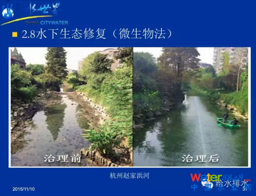 上圖為杭州的趙家濱河,治理前水體非常臭,采用水下生態(tài)修復(fù)(微生物法)治理后,水體清澈。