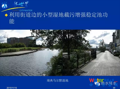 上圖為杭州孔家河,采用穩(wěn)定塘為主的系統(tǒng)治理方式,使其水質(zhì)逐步變好。穩(wěn)定塘的優(yōu)點(diǎn)是具有多功能凈化、沉淀、代謝、水生物吸收、生物膜形成等作用,可以形成良好的水景觀,不產(chǎn)生運(yùn)行能耗。缺點(diǎn)是受地理?xiàng)l件限制,寒冷季節(jié)效果不佳,容易受到暴雨等地表面源污染的干擾影響。利用海綿城市街道邊的小型濕地截污可以增強(qiáng)穩(wěn)定池功能 。