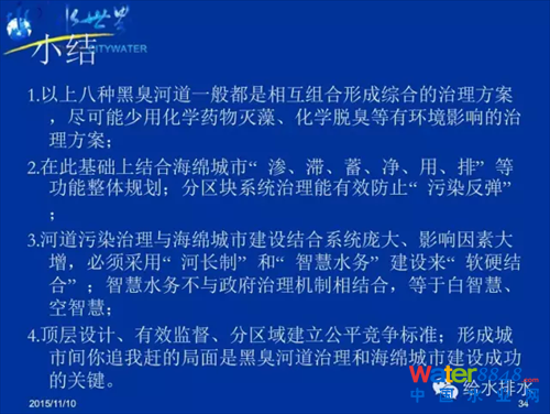 以上八種黑臭河道一般都是相互組合形成綜合的治理方案,盡可能少用化學(xué)藥物滅藻、化學(xué)脫臭等有環(huán)境影響的治理方案。在此基礎(chǔ)上結(jié)合海綿城市“滲、滯、蓄、凈、用、排”等功能整體規(guī)劃,并分雨水流向區(qū)塊系統(tǒng)治理就能夠有效防止“污染反彈”。河道污染治理與海綿城市建設(shè)結(jié)合系統(tǒng)龐大、影響因素大增,必須采用“河長(zhǎng)制”和“智慧水務(wù)”建設(shè)來(lái)“軟硬結(jié)合”整體治理,智慧水務(wù)不與實(shí)際污水治理機(jī)制相結(jié)合,等于白智慧、空智慧。頂層設(shè)計(jì),有效監(jiān)督,分區(qū)域建立公平競(jìng)爭(zhēng)標(biāo)準(zhǔn),形成城市間你追我趕的局面是黑臭河道治理和海綿城市協(xié)同治理成功的關(guān)鍵。