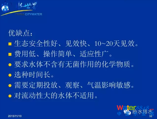 這種方法的優(yōu)點(diǎn)是生態(tài)安全性好、見(jiàn)效快(10~20天見(jiàn)效),費(fèi)用低、操作簡(jiǎn)單、適應(yīng)性廣;缺點(diǎn)是,要求水體不含有滅菌作用的化學(xué)物質(zhì),選種時(shí)間長(zhǎng),需要定期投放、觀察、氣溫影響敏感,對(duì)流動(dòng)性大的水體不適用。