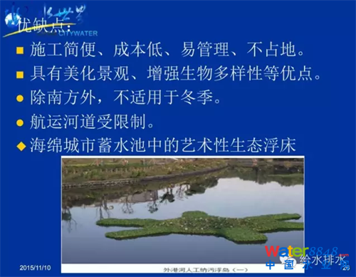 該方法施工簡(jiǎn)便、成本低、易管理、不占地。具有美化景觀、增強(qiáng)生物多樣性等優(yōu)點(diǎn)。缺點(diǎn)是,除南方外,不適用于冬季。且航運(yùn)河道受限制。