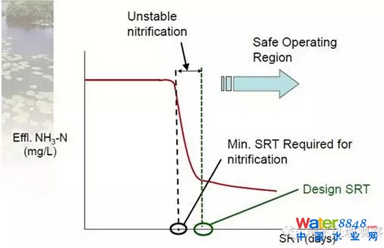 硝化的控制——泥齡的重要性 當(dāng)進(jìn)水氮負(fù)荷有較大的變化時(shí),安全系數(shù)(SRTc/SRTm)就較低,這樣就容易導(dǎo)致出水氨氮超標(biāo)