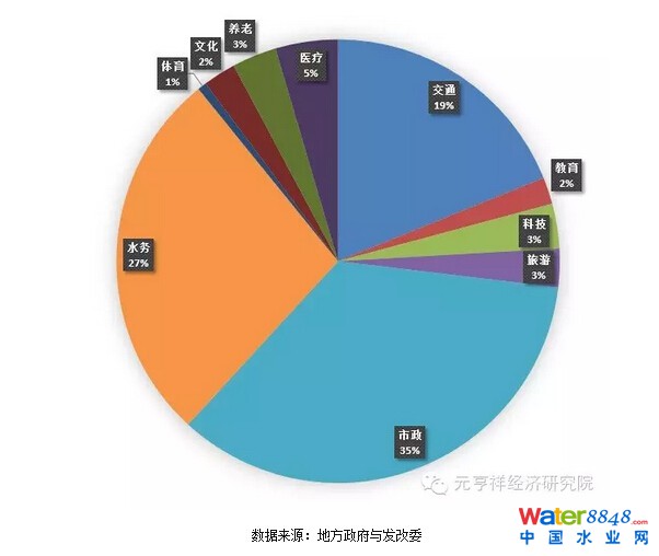 通過(guò)對(duì)全國(guó)各地發(fā)改委提供的已簽約項(xiàng)目的梳理,得到的亦是同樣的結(jié)果——此處需特別說(shuō)明,因財(cái)政部、發(fā)改委對(duì)于項(xiàng)目的歸類稍有不同——如有關(guān)河道整治的項(xiàng)目,財(cái)政部將其歸類為“水務(wù)”大類,而多省發(fā)改委則將其歸類為“環(huán)境綜合治理”類;財(cái)政部示范項(xiàng)目中將地鐵項(xiàng)目歸類為“交通”,而有地方發(fā)改委將其歸類為“市政設(shè)施”中的“基礎(chǔ)設(shè)施”。整體而言,發(fā)改委的項(xiàng)目分類方式在各省間還未實(shí)現(xiàn)一致,故此處為了標(biāo)準(zhǔn)統(tǒng)一,本簽約統(tǒng)計(jì)將采用財(cái)政部對(duì)項(xiàng)目的歸類方式。我們對(duì)項(xiàng)目類型已知的461個(gè)簽約項(xiàng)目進(jìn)行統(tǒng)計(jì),得到如下分布圖: