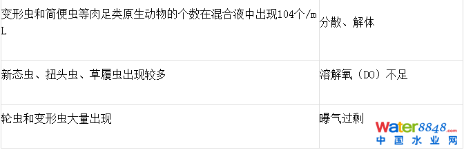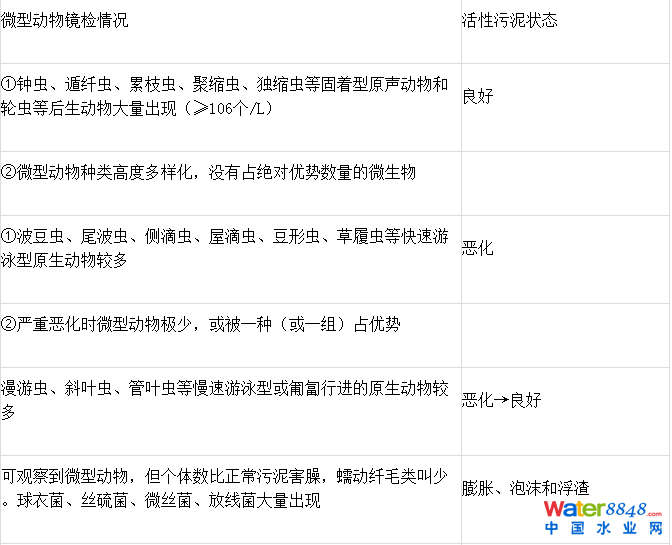 用顯微鏡對活性污泥中的微生物進行鏡檢,其中的原生動物和后生動物(統(tǒng)稱為微型動物)相對比細菌個體大,在顯微鏡下易于觀察、鑒別和計數(shù),且對外界環(huán)境條件的變化更為敏感,作為指示生物來診斷活性污泥的狀態(tài)和性能,在工程實踐中已有較廣泛應用。這種指示作用概括于表1中。