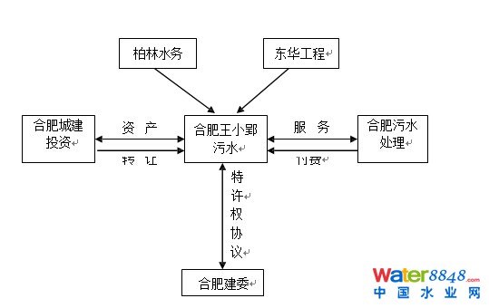 經(jīng)公開(kāi)招標(biāo)確定的中標(biāo)人依法成立項(xiàng)目公司。市建委與項(xiàng)目公司簽署《特許權(quán)協(xié)議》,代表市政府授予項(xiàng)目公司污水處理廠的特許經(jīng)營(yíng)權(quán),特許期限 23 年;合肥城建投公司與項(xiàng)目公司簽署《資產(chǎn)轉(zhuǎn)讓協(xié)議》,落實(shí)項(xiàng)目轉(zhuǎn)讓款的支付和資產(chǎn)移交事宜;市污水處理管理處與項(xiàng)目公司簽署《污水處理服務(wù)協(xié)議》,結(jié)算水費(fèi)并進(jìn)行監(jiān)管。