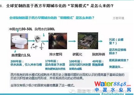 我們來一同追溯歷史,兩百年前,自來水的改善導(dǎo)致了沖水馬桶的普及;一百七十多年前,為了解決住宅區(qū)的衛(wèi)生安全問題,人們開始修建下水道并曾為肥料流失擔(dān)憂;過了兩代多人以后,人們開始修建污水處理廠。一百年前,有人開始建設(shè)污水處理廠,同時,諾貝爾獎的獲得者——哈伯博士發(fā)明了合成氨,使得大家不再擔(dān)心這兩個問題。直到四十年前,西歐國家才開始重視,并在過去系統(tǒng)上增加了脫氮除磷。至此,才形成了目前全球效仿的“傳統(tǒng)模式”。