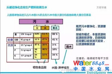 從被動凈化走向生產(chǎn)肥料和再生水,人的排泄物雖然只占污水的1%但含有污水中的大部分有機(jī)物和絕大部分營養(yǎng)鹽。既然污水要凈化,資源要回收:按城市模式,本是資源和能源的排泄物,百倍稀釋后需要以能量消滅能量,以資源降解資源。
