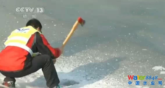 在干渠邊上,南水北調(diào)中線工程易縣段的工作人員,拿起專用工具在冰面上鑿了下去,但冰層很厚,鑿起來頗為吃力,三分鐘后,工作人員鑿出了一個長方形的冰洞。經(jīng)測量冰層厚度為9厘米,冰層下的水溫為零度。