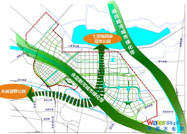 一廊是指串聯(lián)七里海國家濕地公園和東麗郊野公園的生態(tài)景觀廊道;兩帶是指潮白新河和永定新河兩條城市綠化帶。