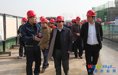 劉玉軍和林文波一行首先查看了污泥處理廠的建設進度、詢問了主要工藝、聽取了工程概況的匯報,對總體施工進度表示滿意。隨后,按照污水處理工藝流程了解了污水處理廠的建設情況,最后在中控室查看了全廠的運行情況,并當場對比污水處理廠出水水樣和自來水的水質,在看到了濁流到清泉的顯著變化,隨行人員紛紛點頭稱贊。