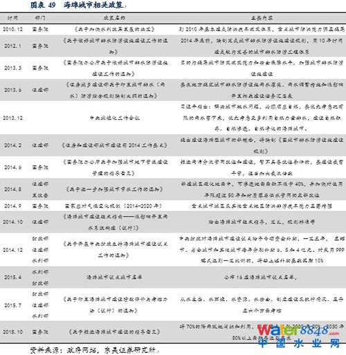 早在2013年12月,習近平總書記在中央城鎮(zhèn)化工作會議上已經(jīng)提出建設自然積存、自然滲透、自然凈化的“海綿城市”;2014年住建部發(fā)布《海綿城市建設技術指南》為海綿城市建設提供方向;2015年4月2日,財政部、住建部和水利部發(fā)文公布首批16個海面城市試點,遷安、白城、鎮(zhèn)江、嘉興、池州、廈門、萍鄉(xiāng)、濟南、鶴壁、武漢、常德、南寧、重慶、遂寧、貴安新區(qū)和西咸新區(qū)獲得首批資格,拉開了海綿城市的建設序幕。中央財政對海綿城市建設試點給予專項資金補助,一定三年,直轄市、省會城市和其他城市每年分別補助6、5和4億元。對采用PPP模式達到一定比例的,將按上述補助基數(shù)獎勵10%,16個城市將獲得中央財政210-230億元補貼。
