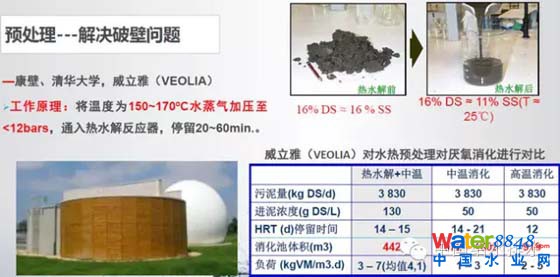 這三個(gè)方面有不同的技術(shù)路線(xiàn)。第一個(gè)破壁問(wèn)題,有微波的等等預(yù)處理手段,但是現(xiàn)在大家好象都認(rèn)同熱水解,熱水解確實(shí)能使得破壁,同時(shí)使得不流動(dòng)的厭氧污泥變得流動(dòng)。以威立雅為例,以前的池容比較大,停留時(shí)間比較長(zhǎng),通過(guò)熱水解之后污泥濃度提高的本身使得池容消減,同時(shí)效率負(fù)荷也提高,但是它仍然采用的是厭氧消化池,在某些程度上緩解了這種問(wèn)題。我們可以期待北京的污泥厭氧消化工程能夠有好的表現(xiàn),北京的污泥有機(jī)質(zhì)含量有時(shí)候是比較高的,可達(dá)60%以上。