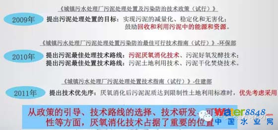 我國(guó)污泥處理處置現(xiàn)狀,這張片子主要講現(xiàn)在2015年3500噸也好,4000噸也好,到2020年達(dá)到6000噸也好,污泥的量是在不斷的增加,確實(shí)達(dá)到相當(dāng)?shù)臄?shù)量。國(guó)家的"水十條",建設(shè)部、發(fā)改委等相關(guān)文件都有相關(guān)的要求,技術(shù)路線(xiàn)以前都在講不是非常明確,實(shí)際上從現(xiàn)有的政策來(lái)講,資源化、能源化導(dǎo)向是非常明顯的,而且從政策的導(dǎo)向來(lái)看,從這幾年發(fā)布的國(guó)家級(jí)別的文件來(lái)看,厭氧消化占據(jù)了重要的位置。