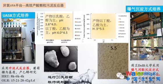 第三點(diǎn)厭氧顆粒污泥取得成功,顆粒污泥是提高反應(yīng)器和效率的有效技術(shù)。怎么提高效率,我們實(shí)際上剛才在低PH下不同負(fù)荷的圖可以看出來(lái),在高負(fù)荷下效率是下降的,所以整個(gè)提高效率其中之一是產(chǎn)酸的情況下能不能形成顆粒污泥。