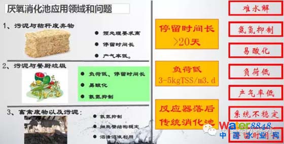 此外,厭氧消化池應(yīng)用領(lǐng)域和問(wèn)題,像污泥與秸稈廢棄物,預(yù)處理要求高,停留時(shí)間長(zhǎng),產(chǎn)氣率低。污泥與餐廚垃圾,負(fù)荷低。還有就是畜禽廢物以及污泥。這里停留時(shí)間長(zhǎng),污泥大約20天,在德國(guó)都是大于40天的,今后要用在垃圾上可能停留時(shí)間更長(zhǎng)。