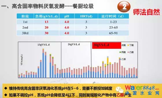 我們兩種方式進(jìn)行了培養(yǎng),一種最傳統(tǒng)的國(guó)際工藝方式,一種好氧顆粒污泥的方式。產(chǎn)氧污泥跟酸化合起來(lái)以后,我們酸化負(fù)荷達(dá)到20公斤,而后續(xù)處理的負(fù)荷也是能夠達(dá)到23公斤,從整體上來(lái)看,一個(gè)產(chǎn)酸的反應(yīng)器加一個(gè)甲烷的反應(yīng)器的話(huà),整體的負(fù)荷達(dá)到平均20公斤左右,整個(gè)的停留時(shí)間達(dá)到了不到4天,而上一個(gè)圖可以看出水非常好,出水總的COD是500毫克升。這是用餐廚垃圾做的一個(gè)結(jié)果(PPT)。