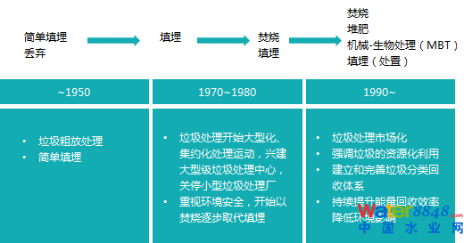 概括而言,在治理思路上,發(fā)達(dá)國(guó)家所走過(guò)的路有這樣幾個(gè)大的趨勢(shì):逐步取代/淘汰填埋;集中化、大型化處理;提高資源化利用率;市場(chǎng)化(第三方處理)等。