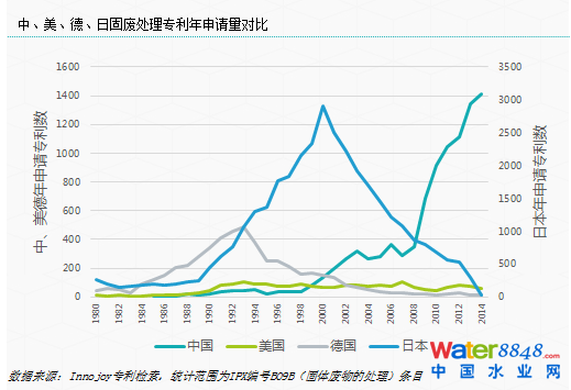 首先提出一個(gè)問(wèn)題——我們處于固廢處理技術(shù)創(chuàng)新的哪個(gè)階段?帶著這個(gè)問(wèn)題,我們先來(lái)將該領(lǐng)域中國(guó)的技術(shù)年申請(qǐng)量與三個(gè)先行發(fā)達(dá)國(guó)家:美國(guó)、日本、德國(guó)進(jìn)行對(duì)比分析。